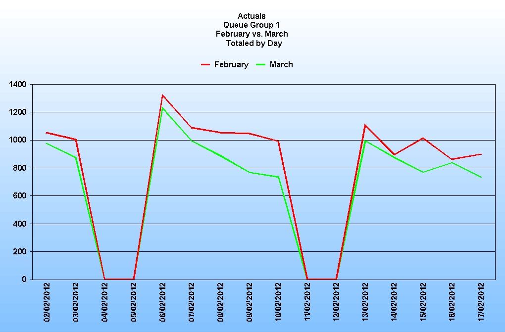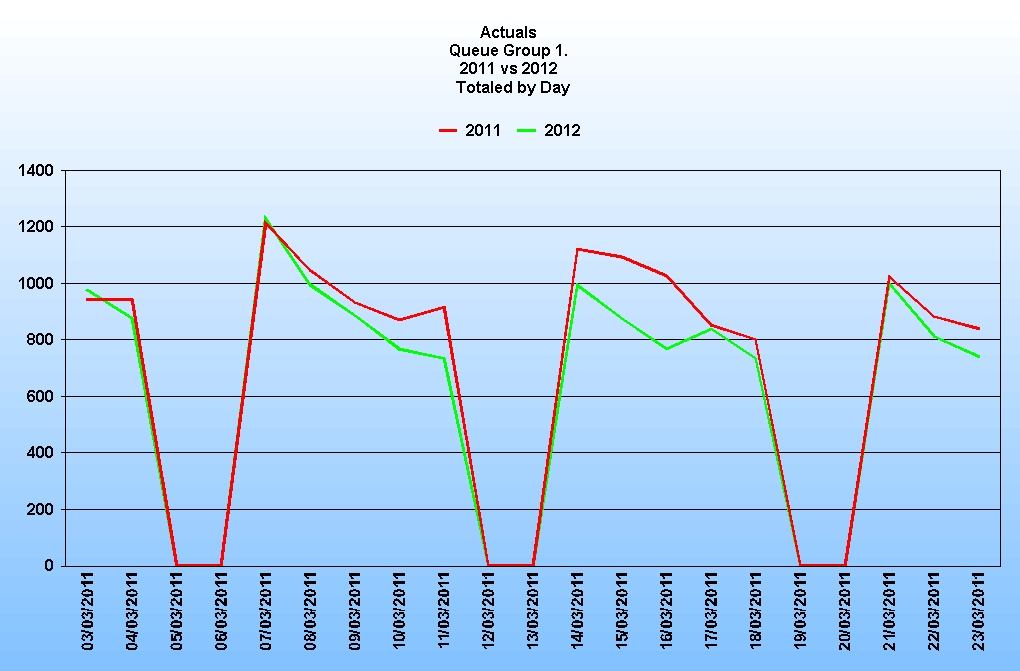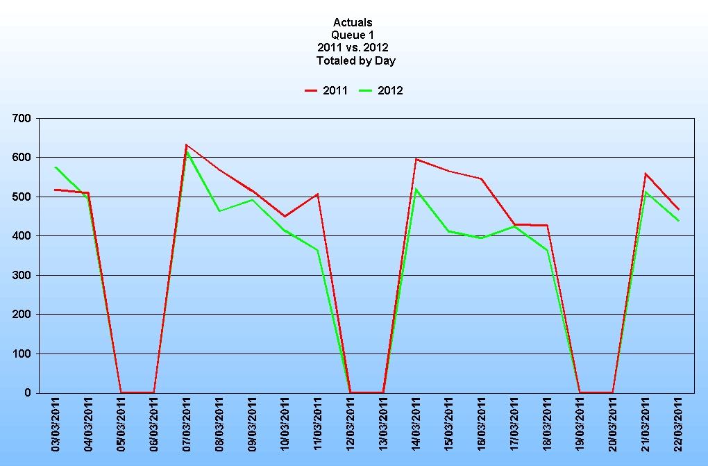 In this case, two comparisons were made – an annual comparison and a monthly comparison. Using actual data from March 2012 (up to the 20th) comparisons were made between Feb 2012 and Mar 2012, and also between Mar 2012 and Mar 2011 for a selection of queues which are shown below: