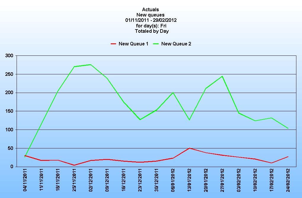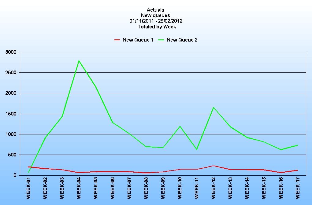 There are two queues for which there is only actual data from November 2011 which were identified in part 1 of this document. The above forecasting method is not suitable for these queues so they should be excluded and forecast separately.